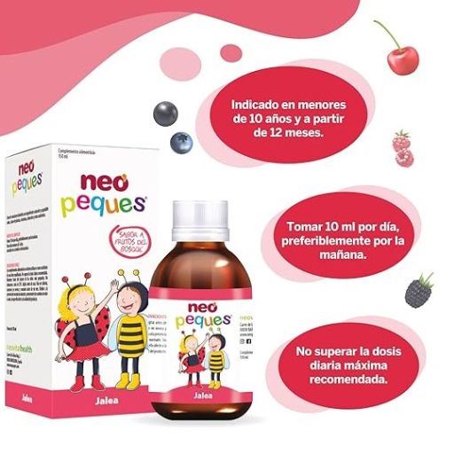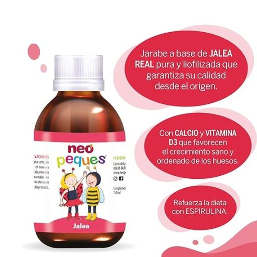 Neo Peques Jalea es un jarabe infantil formulado para apoyar el crecimiento, la energía y el sistema inmunitario de los más pequeños. Su contenido en jalea real liofilizada, junto con calcio, vitamina D3, espirulina y otros nutrientes esenciales, ofrece un aporte natural que favorece el desarrollo y bienestar diario de los niños desde 1 año en adelante.
