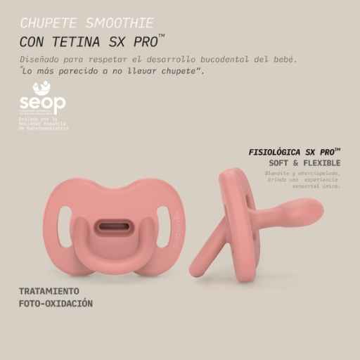 Cuenta con la exclusiva tetina fisiológica SX Pro, diseñada para respetar el desarrollo bucodental del bebé. No invade la cavidad oral y ofrece una sensación natural similar a cuando el bebé no lleva chupete. Su forma simétrica asegura que siempre quede bien colocado en la boca, favoreciendo un uso seguro y adecuado.