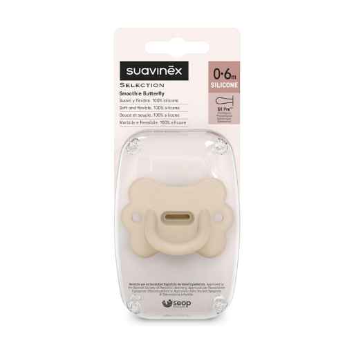 El Suavinex Chupete Todosilicona Butterfly Beige es la última innovación de la marca en chupetes 100% silicona, combinando diseño, suavidad y seguridad. Fabricado en una única pieza de silicona SOFT & FLEXIBLE, ofrece una textura blandita y aterciopelada que proporciona al bebé una experiencia sensorial única.